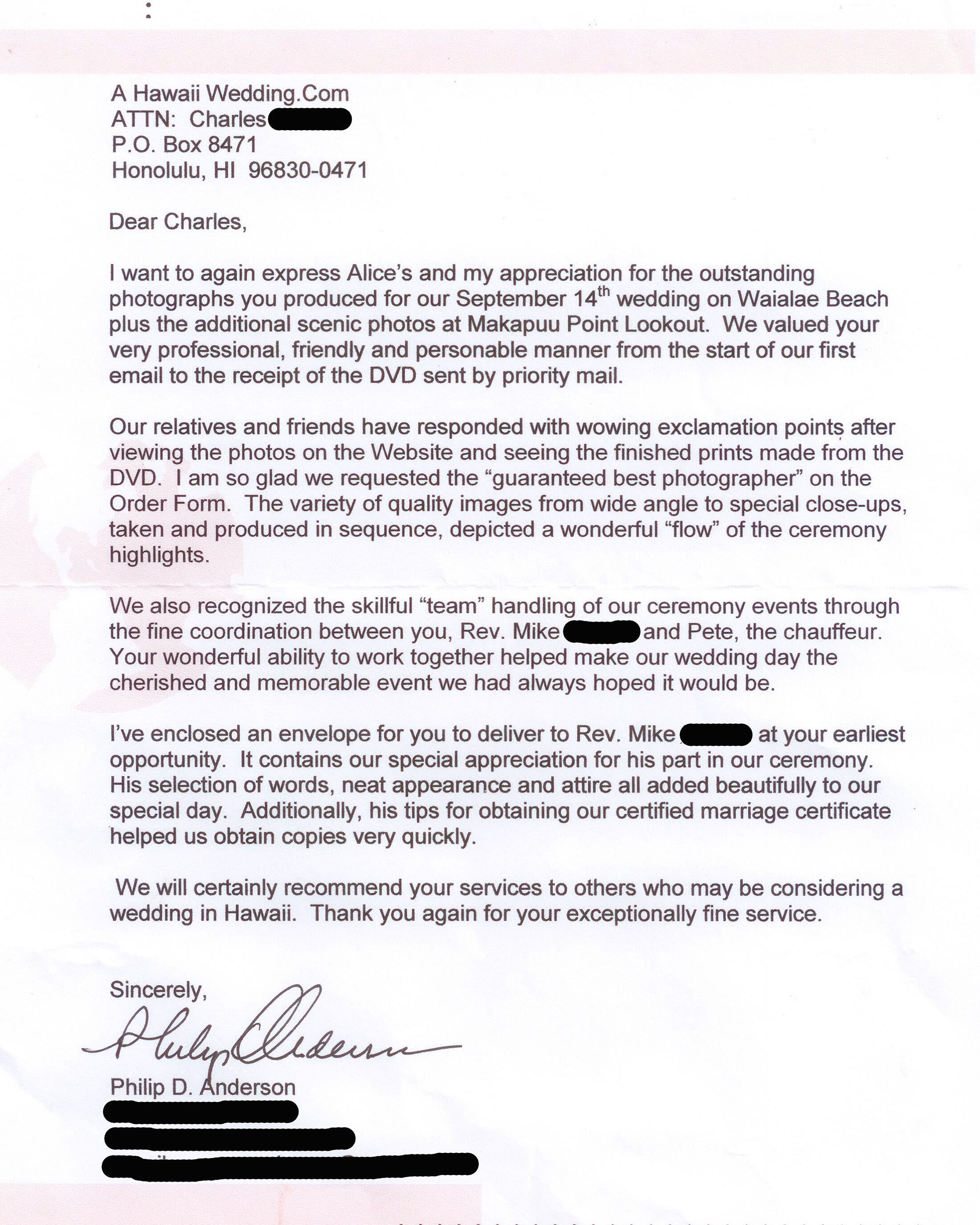 We will certainly recommend your services to others who may be considering a wedding in Hawaii. Thank you again for your exceptionally fine service.